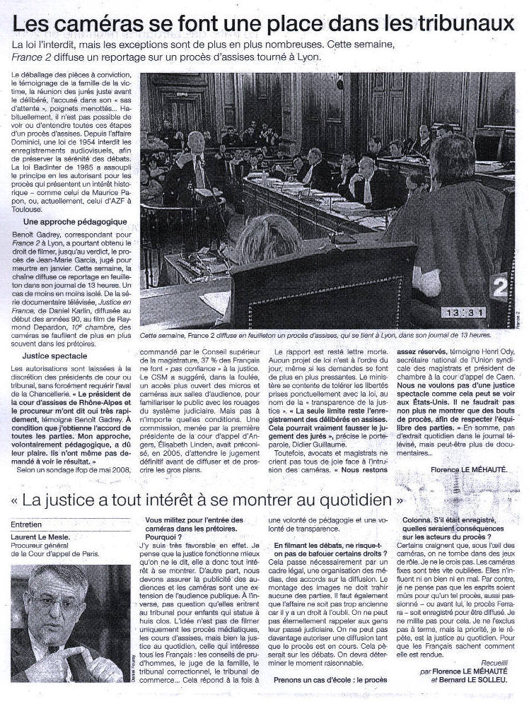 Article sur l'arrivée des caméras dans les tribunaux dans le Ouest-France du 11 mars 2009 et entretien avec Laurent Le Mesle, responsable de la Cour d'appel de Paris.