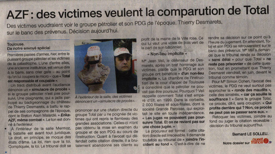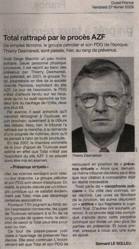 Permalink[Justice] Total rattrapé par le procès AZF- Ouest France du 27/02/09 / Bernard Le Solleu / Ouest-France (2009)