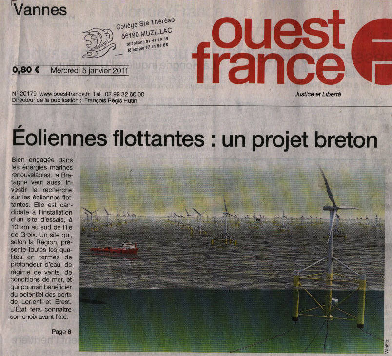 Eoliennes flottantesImage Jpeg Bras Jean-Laurent. « Eoliennes flottantes : un projet breton » in Articles de quotidiens scannés, 1 (janvier 2011).Documents numériques